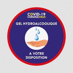 Signalétique adhésive rond « Gel hydroalcoolique à votre disposition » avec visuel contre le covid19