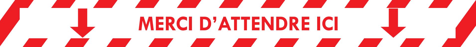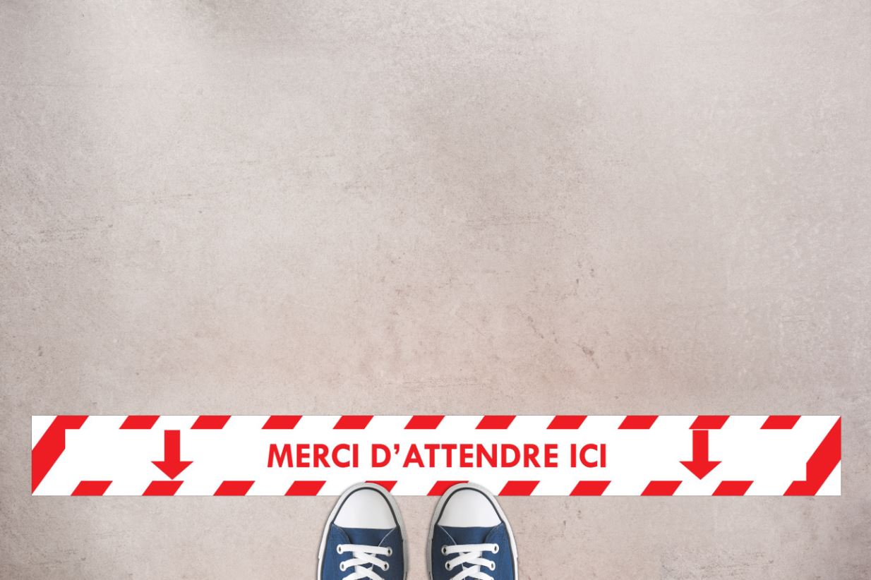 Signalétique adhésive antidérapante spéciale sol « Merci d’attendre ici » pour mettre en place les mesures de gestes barrières et consignes d’hygiène pour lutter contre le COVID19