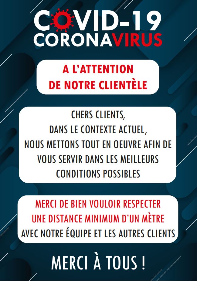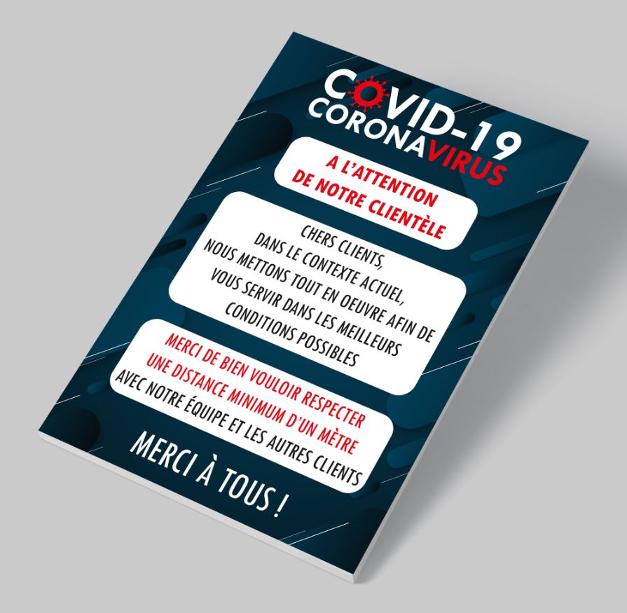 Les affiches sont des supports pratiques pour une communication efficace et rapide, notamment cet affichage à destination clientèle pour respect des consignes et gestes barrière COVID19 des clients